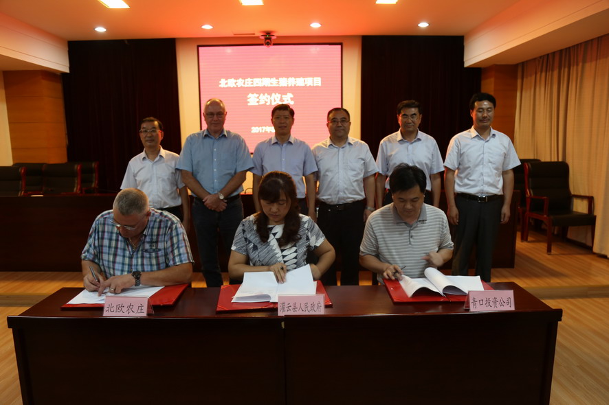 8月7日下午,北欧农庄四期生猪养殖项目签约仪式在灌云县行政中心举行。leyu(中国)公司领导杨龙、胡建明、陈如军,灌云县领导朱兴波、王庆嘉、张凌云,丹育公司董事劳伦斯·桑德高,连云港北欧农庄生猪养殖有限公司首席执行官杨林柏等出席签约仪式。