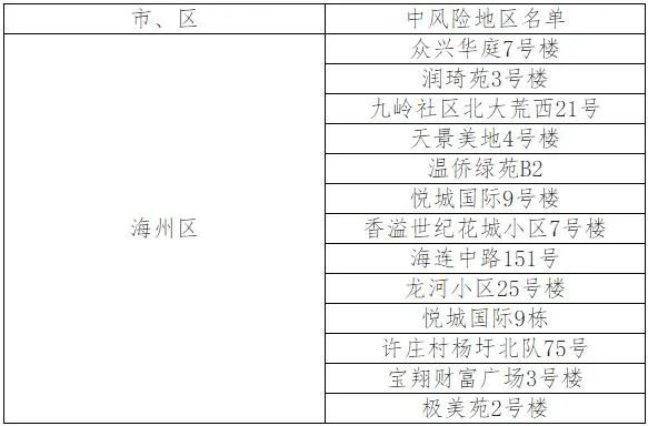 根据国务院联防联控机制有关规定,经综合评估研判,市指挥部决定,自发布之日起,将龙河小区25号楼、悦城国际9栋、许庄村杨圩北队75号、宝翔财富广场3号楼、极美苑2号楼调整为中风险地区。