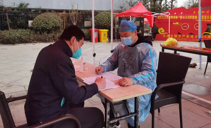在该小区核酸检测点,一名身穿防护服的男生也引起了大家的注意,在整齐的队伍旁边,他忙碌地来来去去,一会儿维持秩序,一会儿将行动不便的老年人引导到绿色通道前,忙得不亦乐乎。这位小伙子叫袁晨,是上元公司的一位预备党员,当居民问到他累不累时,他笑了笑:“我是一名青年,那些医护人员和社区工作者才辛苦。我觉得,穿上防护服的那一刻,我仿佛也成为了一名白衣天使,虽不及医护人员那么伟大,但做着自己力所能及的事,为疫情防控贡献一份力量,我发自内心的快乐,浑身也充满力量。”
