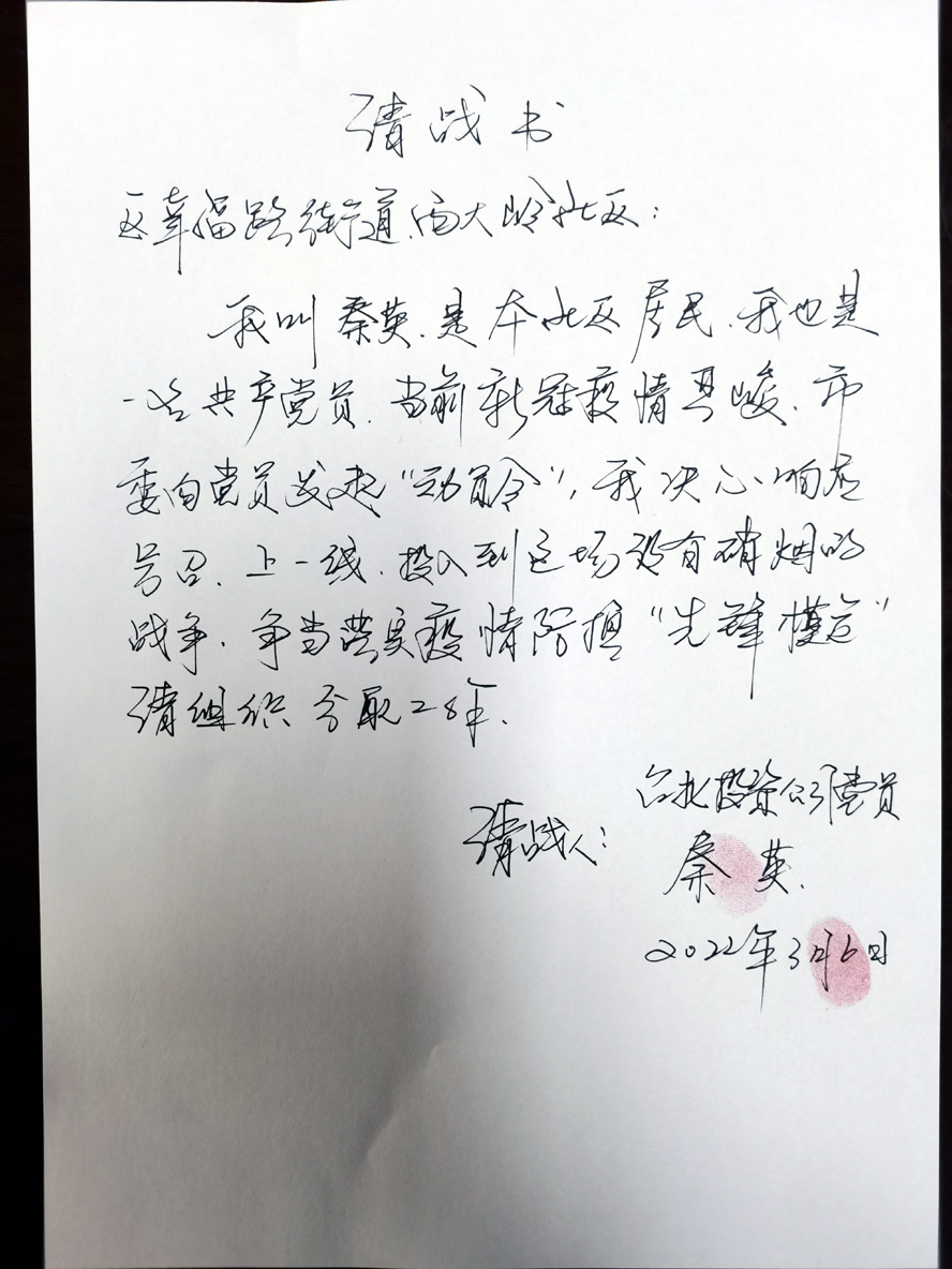 随着市政府的快速响应,不到中午就开始全区核酸检测,突地一下工作人员不够用了。“疫情就是命令,防控就是责任”,秦英主动联系海州区幸福路街道西大岭社区,在咨询志愿者报名的同时,郑重地并向社区递交了一份疫情防控“请战书”。与此同时,她还动员她所在的“工投舞蹈队”一帮姐妹,迅速成立一支抗疫志愿者队伍,自发维护小区防控秩序,参与小区喷洒消毒、卫生清扫、邻居物资代购、心理疏导等工作中。几千人的小区在她的感染带动下,拧成一股绳、攥成一个拳,群防群控,筑起一道广泛坚实的防疫战线。