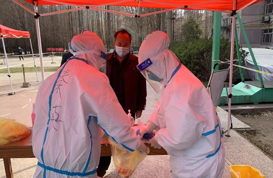 然而随着疫情愈发严重,小区核酸检测员人手又紧张了起来,“我可以,这几天我都学会了,最基本的我都会”秦英又是第一个举手到最前线。这下她更忙了,每天凌晨三点起床做饭,五点社区报到,一直坚守到晚上八点。为了节省防护服,她一般都要等到中午2点多钟才休息吃饭,这股毅力让社区、街道领导看在眼里、服在心上,连一直牢骚怪话的几个群众也为她由衷地竖起大拇指。