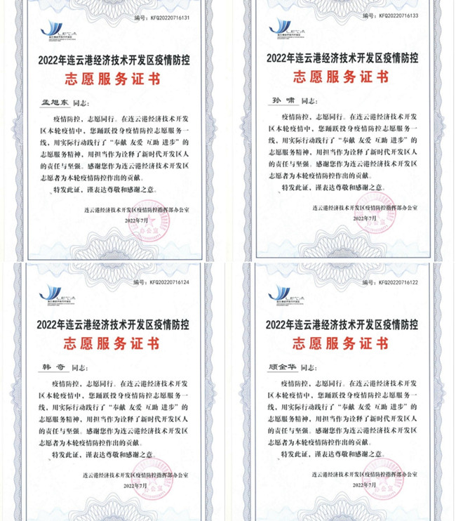 近日,连云港经济技术开发区领导来到公司,对氨纶公司积极参与疫情防控工作表示感谢,并向公司志愿者颁发了疫情防控荣誉证书,感谢他们在疫情防控中所作出的积极贡献。