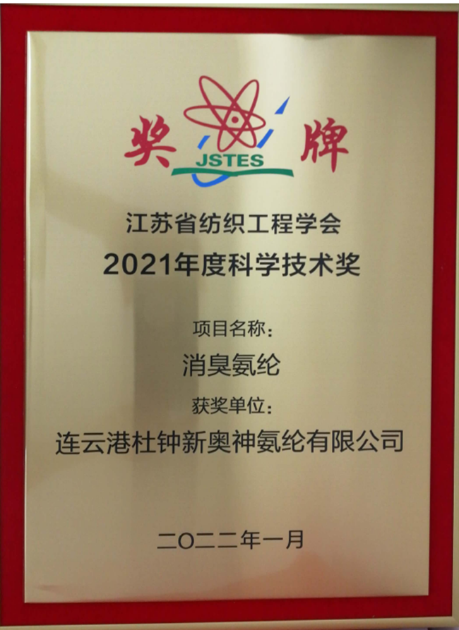 日前,杜钟氨纶公司2021年申请参评的两项自主研发新产品《温感形状记忆氨纶》、《消臭氨纶》被授予江苏省纺织工程学会2021年度科学技术奖。