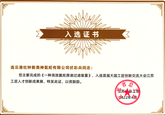 根据省、市总工会部署要求,氨纶公司积极组织工匠人才参展。经评选,公司伏彩兵主要完成的《一种高效氨纶原液过滤装置》创新成果入选大国工匠展,伏彩兵还入选了首届大国工匠创新交流大会江苏展区重点展示科创推荐通道。