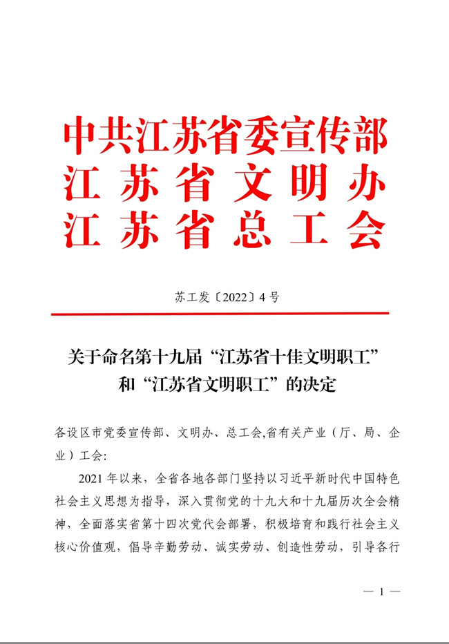 近日,由江苏省委宣传部、省文明办、省总工会联合开展的第十九届“江苏省十佳文明职工”评选活动结果揭晓。氨纶公司员工胡军荣获“江苏省文明职工”称号。