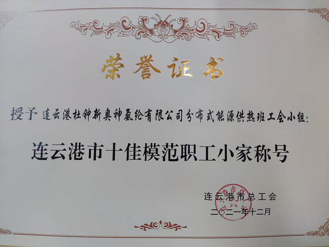 日前,氨纶公司分布式能源供热班工会小组荣获市“十佳模范职工小家”称号。