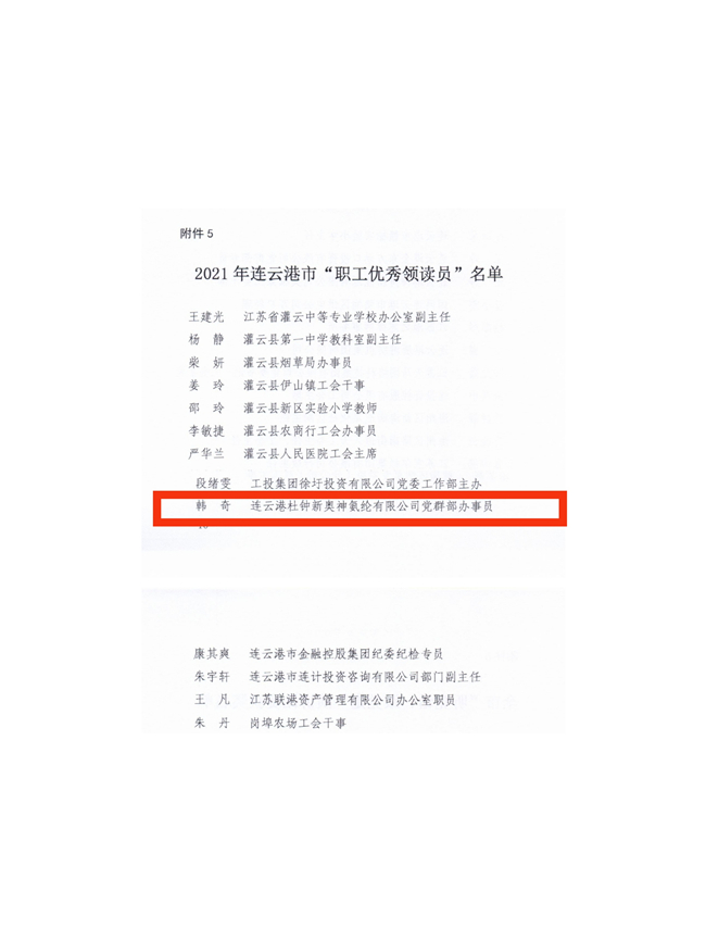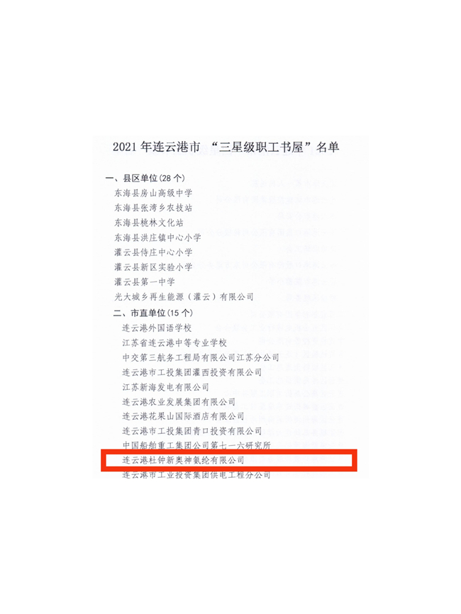 日前,连云港市总工会下发的《关于2021年连云港市“星级职工书屋”、职工优秀领读员情况通报》,杜钟氨纶公司获评2021年度连云港市“三星级职工书屋”、韩奇获评2021年连云港市“职工优秀领读员”,标志着公司职工书屋建设再上新台阶。