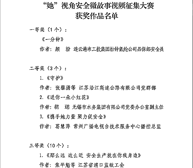 日前,江苏省总工会开展以“携手她力量 暖心聚力促安全”为主题的“她”视角安全微故事视频大赛评选结果正式公布,公司选送的《一分钟》安全微故事荣获大赛一等奖。