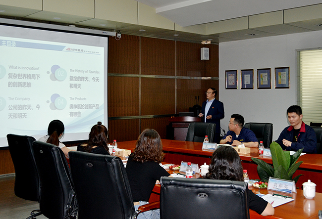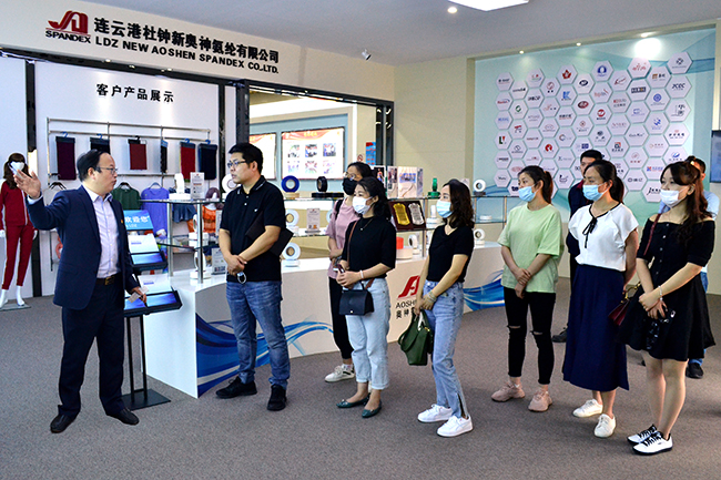 孙滨部长一行先后参观了公司展厅、八期生产线、自动化包装线、自动化立体库、研发中心,公司总经理张斌对我公司的发展历程,差别化产品、战略优势等进行了详细介绍,孙滨部长对我公司低温热粘合氨纶、抗菌氨纶、驱蚊氨纶的功能特点、应用效果等进行了细致了解。