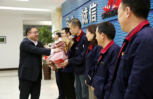 杨董事长进基层、到一线,与劳模先进面对面交流,倾听他们的心声和意见,感谢他们长期以来为企业发展作出的贡献,并献上一束鲜花、送上一封慰问信、发放一张蛋糕卡、特制一张健康卡、送上一份祝福。