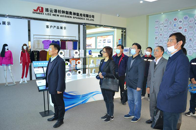 蒋教授一行先后参观了公司产品展厅、八期生产线、研发中心,公司总经理张斌对氨纶公司的发展历程,差别化产品、战略优势等进行了详细介绍,蒋教授对氨纶公司低温热粘合氨纶、抗菌氨纶、驱蚊氨纶及氨纶生产全流程自动化、智能化生产线等给予了高度评价。