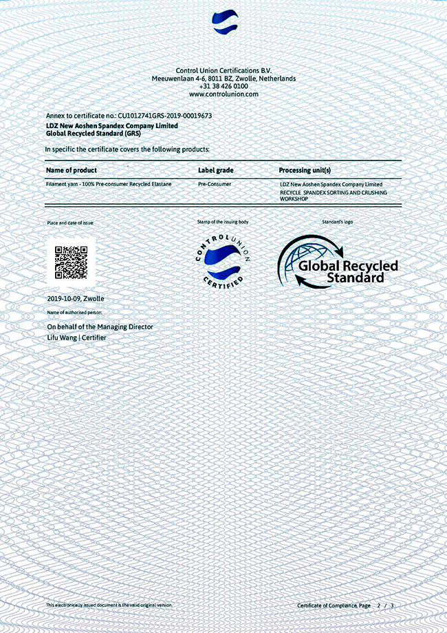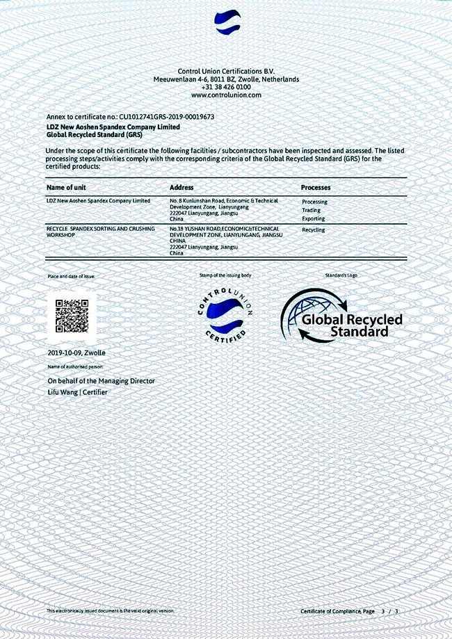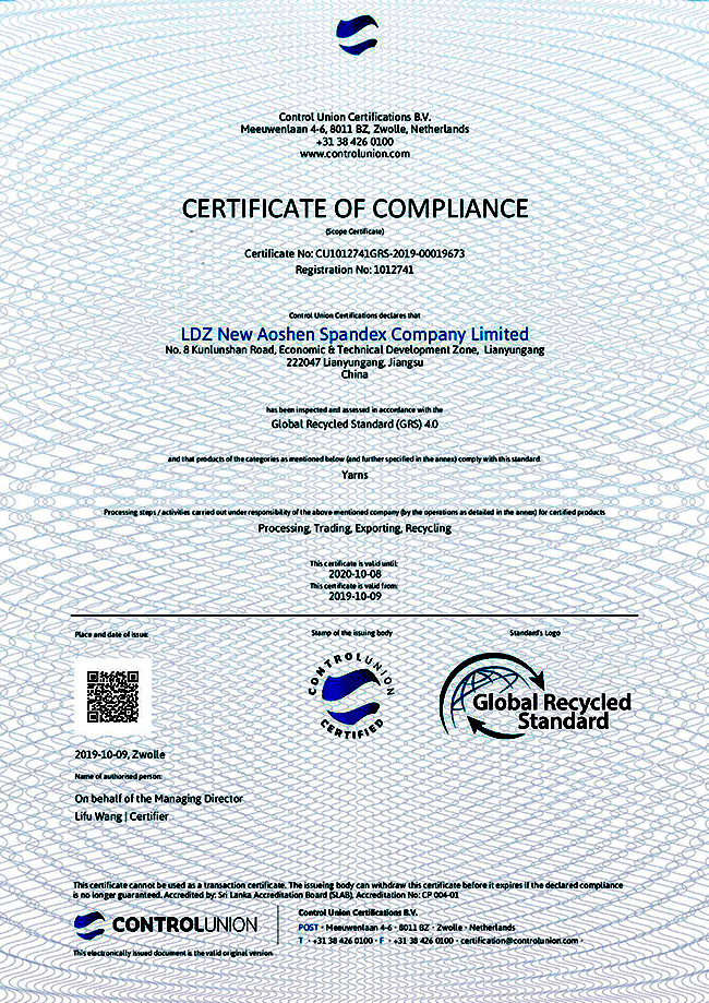 2019年10月9日,连云港杜钟新奥神氨纶有限公司通过全球回收标准认证,取得GRS证书,即获得对再生氨纶纤维生产的资质,可根据客户需要提供贸易证书(TC)和全球认可的GRS吊牌。