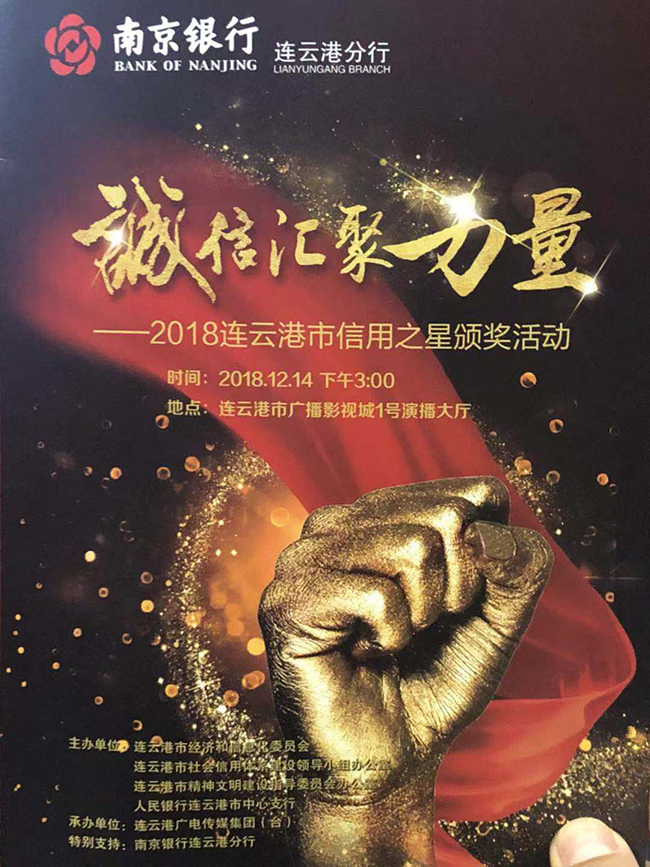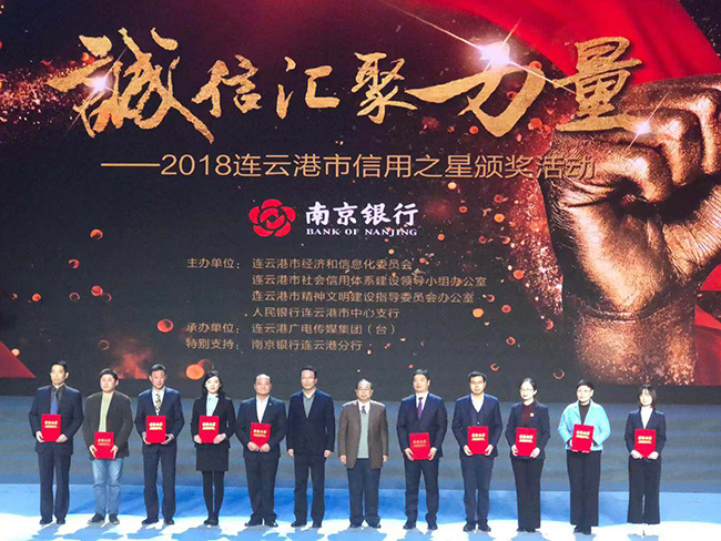 12月14日,为深入贯彻习近平总书记关于诚信建设的重要指示精神,由市经信委、市社会信用体系建设领导小组办公室、人民银行连云港市中心支行主办的“诚信汇聚力量”推介评选“港城信用之星”暨“诚信建设万里行(连云港站)”颁奖活动在连云港市电视台1号演播厅隆重举行。