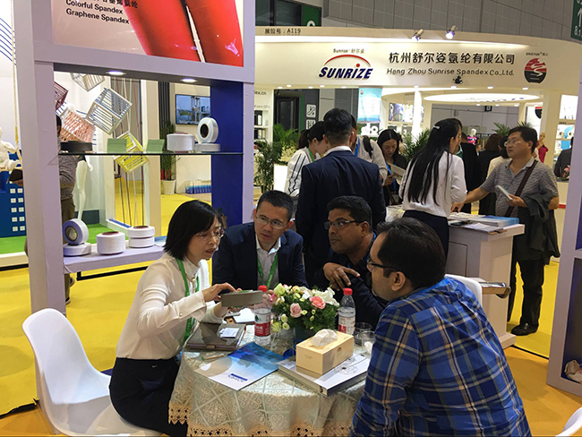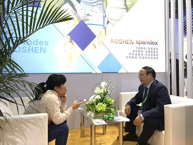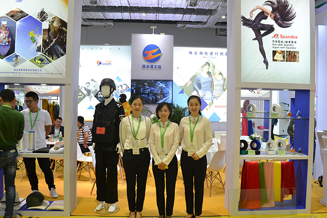 展览会上,化纤协会王会长带领的贵宾参观团一行亲临我公司展位进行参观交流。其他前来咨询、洽谈业务的国内外客商络绎不绝,氨纶公司的8大系列产品成为大家关注的焦点,来自孟加拉、印度、土耳其、日本等国家的客商纷纷表达了与公司深入合作的强烈意向,大家特别对公司新品石墨烯氨纶、低温热粘合氨纶等产生了浓厚的兴趣。展览会上,氨纶公司总经理张斌接受了化纤协会和纺织报的专题采访,张总详细介绍了公司大力实施差别化战略,在引领氨纶行业流行趋势过程中,重视新品研发、品质保证、品牌打造方面的生动实践。神特新材和奥神新材分别展示了超高分子量聚乙烯纤维防弹系列产品和聚酰亚胺防火耐高温系列产品,广大客商纷纷驻足参观,垂询交流。
