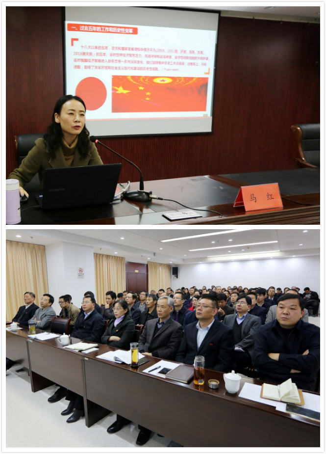 本场报告会邀请市委党校沿海开发研究室副教授马红主讲。马红教授以《不忘初心,牢记使命,为实现中华名族伟大复兴的中国梦不懈奋斗!》为主题,从鲜明主题、历史性变革、主要矛盾的深渊影响、两个一百年奋斗目标、全面从严治党等13个方面出发,引用了古今中外大量案例,配合通俗的语言和生动的幻灯片,系统而详实地向在座党员介绍了“党的十九大报告”精神与内涵,并结合经济建设的相关内容,给我公司的发展提出了宝贵意见。