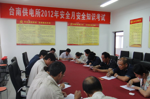 6月27日下午,为进一步增强员工的安全意识、强化安全责任、端正安全态度、规范安全行为、创造安全环境,台南供电所组织安全知识考试。 该所对此次考试高度重视,严格遵循普及全员、侧重基础、切合实际、易于实行的宗旨,围绕《安全生产法》、《三项制度》、《供电班组管理考核办法》等相关内容,提前编制、发放学习资料。全体员工都深刻认识到安全的重要性和必要性,积极应对此次闭卷考试,利用集体辅导和个人自学的形式,全身心地投入到学习热潮中,真正营造了“科学发展,安全发展”的浓厚氛围。(朱兵)