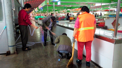 国庆佳节来临之时,也正是农贸市场创卫工作关键时刻,在主任赵怀忠带领下,全体职工放弃休假,全身心投入创建工作中。加大市场卫生清理力度和管理力度,组织人员抓好市场卫生保洁。并按照市创卫办要求,抓好市场门前居民户违建拆除后现场清理工作。对墙体进行粉刷,对楼道杂物、地面垃圾清运,对地面进行整理,对占道经营商贩加强管理。全体职工顾大家舍小家,克服困难,坚守创卫一线。主任赵怀忠父亲生病住院,他也顾不上去照料,整天奔忙在市场创卫工作中。节日期间,海州区、巨龙街道等单位领导到市场检查工作,对巨龙农贸市场给予高度评价。(司宣)