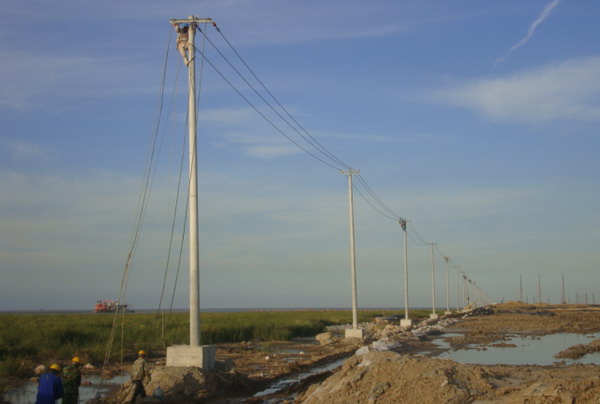 连云新城三期供电线路紧贴海堤边。受海堤建设进度和海风海潮的影响,低矮的坝堤经常被风刮起的海浪浸顶,石块突起,洼水涟漪,淤泥缠足,堤边路面凹凸不平,道路仅限一辆车通行,拥挤不堪,工程施工难度极大。为提升速度,加快进度,台北供电所克服困难,紧锣密鼓地展开工作,以期早日完工。现场勘察地形地貌,了解潮汐运动规律,制定施工计划,设计措施方案,组织人力,采购材料,投入施工。施工人员采用弹性工作时间,利用落潮时机,抢运电杆,及时立杆和装配。职工们发扬不怕苦,不畏难的精神,不惧海风吹脸、海水浸衣,爬上距离海平面二十多米仿佛摇摆不定的高杆,悬在空中一丝不苟地操作,保障了工程的全面竣工。