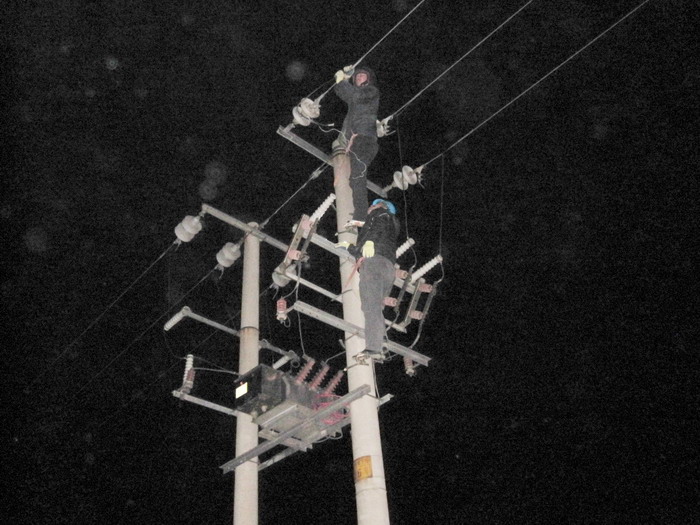 时下正是养殖扬水高峰期。3月6日晚20:37分,值班人员接到用户电话反映:黄下线电压不稳,变压器及配电箱声音异常,并发现高压线路有火光现象,值班人员赵勇及时到现场。经查看,是黄下线26号杆柱上断路器,A相铜铝桩头养化接融不良所致。原因找到后,从21:05分组织人员进行抢修,抢修人员克服夜间天黑等诸多困难,21:56分及时恢复供电,保证了养殖抢水。(宋中文 李卫田)