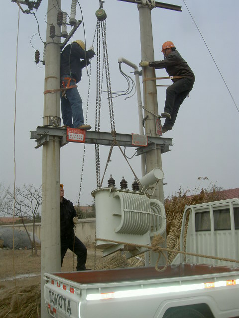 春节前夕,徐圩供电所加大电力设备和线路巡视维护力度,将预防大面积停电事故作为节前安全生产的首要任务。该所认真组织人员深入辖区查找线路和设备存在的安全隐患,提前作好安排和准备,2月5日发现辛高圩地区99#变压器节日期间容量可能不够,便及时调换了变压器,确保用电安全。(图为该所职工在调换变压器)(马德松)
