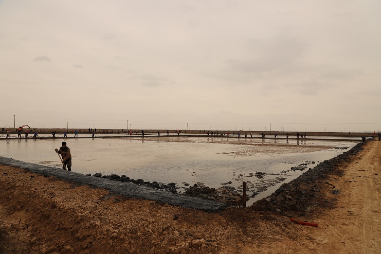 11月29日上午,虽然天气寒冷,但是在海盐基地新改造的制卤滩上,却到处是一派火热的劳动景象,参加“大会战”的工人多达100余人,只见他们有的泼水,有的铲泥,有的捞沟,有的做埝,大家分工协作。据了解,为了提高海水制卤能力,确保海盐产量,今年公司专门对海盐基地部分废弃滩地进行了改造,以进一步增加制卤面积。近期,随着改造工程接近尾声,公司又组织精干力量对新改造滩地继续进行修整,以确保新建的制卤滩地能够尽快投入使用,为明年海盐生产工作的正常有序开展奠定扎实的基础。