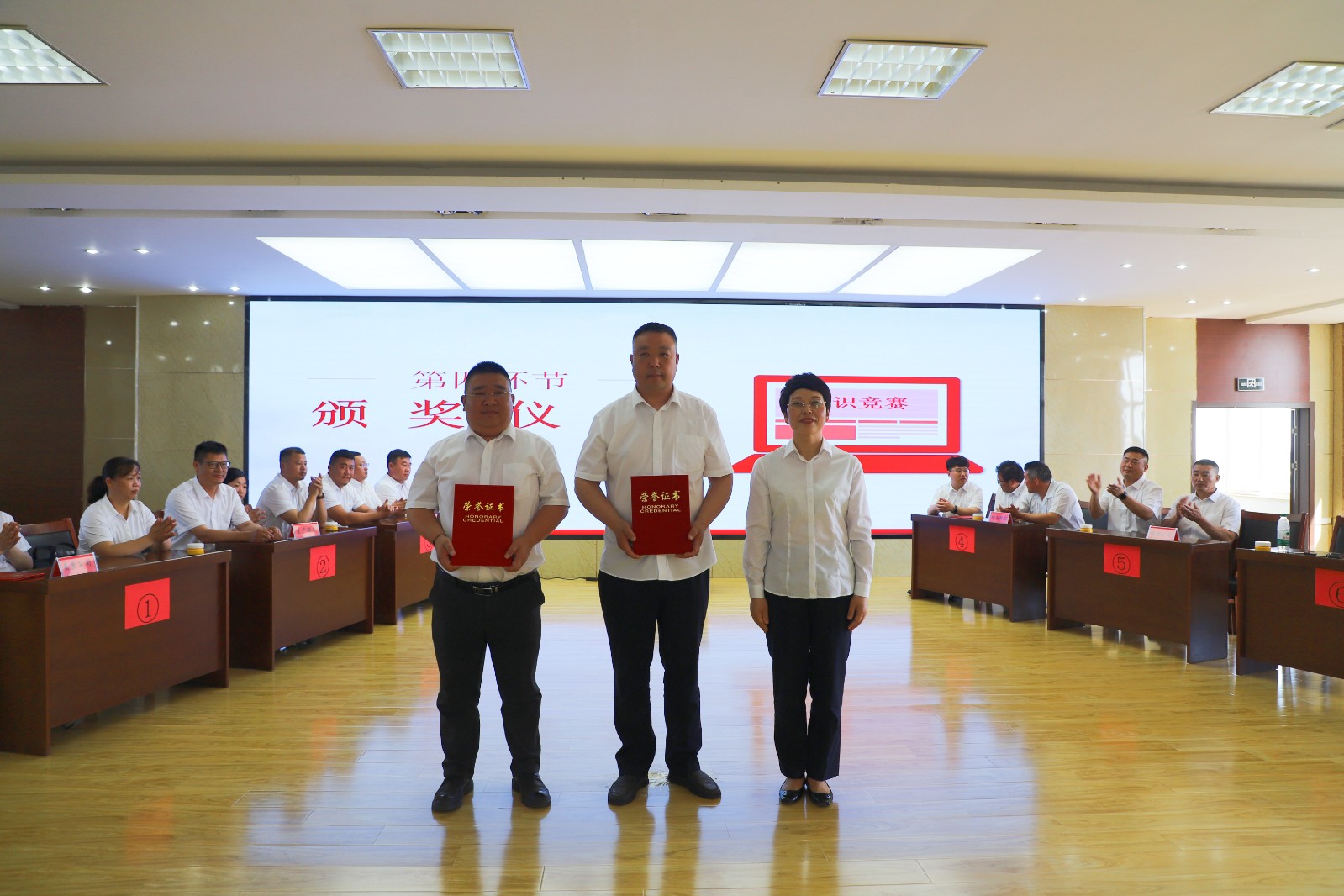 决赛过程紧张而激烈,选手们表现出高度的参与热情与流畅的应答能力。竞赛形式包括必答题、抢答题、单位负责人答题及观众互动题等,分数随着比赛的推进而逐渐攀升。在抢答环节中,部分代表队因抢答违规被扣分,而部分队伍则采取稳健策略,虽抢答次数不多,但得分依然可观。值得一提的是,各参赛单位负责人现场参加答题比赛,所得分数算入参赛队伍的总得分。