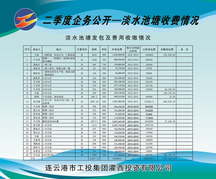 1、淡水养殖池塘发包及费用收缴情况。共发包淡水养殖池塘面积21837.14亩,应收租赁费1593.8537万元,已收租赁费1398.23028万元,欠收租赁费195.62342万元,收缴率为88%。