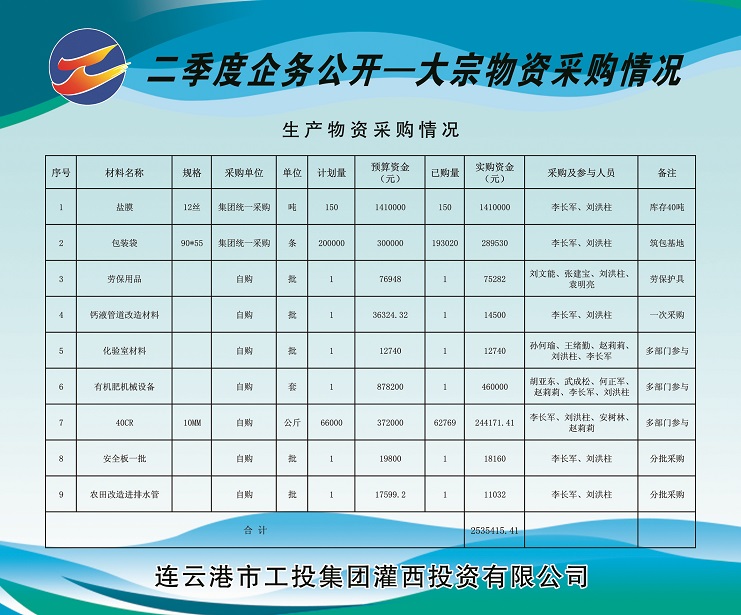 1、由leyu(中国)公司集中采购塑料布(盐膜)150吨(由工投leyu(中国)运营监管部在总部组织招标)、包装袋20万条,实购金额计169.953万元。