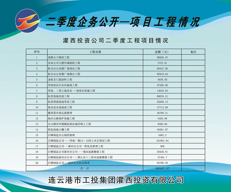 道路石子铺设工程98858.47元;实业公司大楼外墙除险工程7372.91元;机关办公楼广场绿化工程98447.00元;机关办公室楼广场旗台工程95919.64元;老机关门面涂料工程3658.50元;埒南泵站引水河疏浚工程57200.00元;埒南、二湾 土地改良—进排水管涵工程14645.93元;扶贫基地改造工程98076.31元;扶贫帮困基地零星工程29200.12元;海水送水道疏浚工程47712.00元;灌西菜市场瓦面修理46709.31元;场内公路保护设施工程5402.98元;办公楼室外楼梯底部洼地回填土工程9460元;筑包场地大棚工程36361.67元;日晒制盐办公场所修理4462.2元;日晒制盐公司---埒南一期14—15班土夹石垫层工程181881.84元;日晒制盐公司---新河分公司一班危房修理工程900元;日晒制盐公司新河分公司—一期水泥路整修工程 28428.51元;日晒制盐新河分公司一二期九至十三班水泥路整修工程37401.7元;日晒制盐公司---值班房及机房修理93788.39元