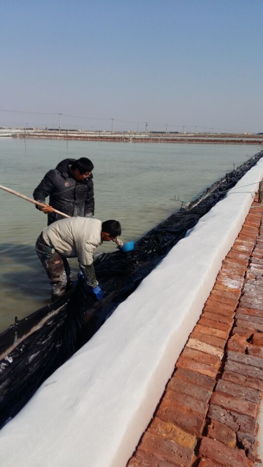埒南制盐分公司认真做好滩场文明工作,做好“三雨”期间的塑池管理,减少塑池卤水跑冒滴漏,最大限度地提高生产文明化水准,提高卤水利用率,为降本增效打好基础。图为职工在降雨后及时进行整理塑布。(耿刘)