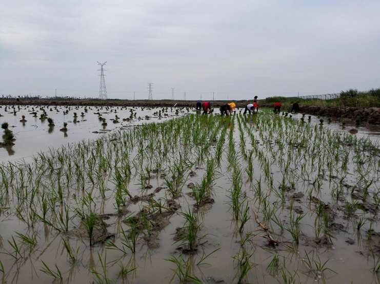时下正值水稻插秧的大好时节。6月5日,实业公司组织人员四十余人,对农业分公司埒南片区的90亩稻田进行适时插秧。历时3天,今日即可完成插秧任务。 连日来,工人们克服天气炎热等因素,抢时间赶进度。从运苗、分苗到插种,田地里呈现一片忙碌景象。从远处看绿油油的一片,一株株嫩苗整齐地排列在水田里。下一步将做好插秧后的排碱、灌溉、施肥等工作,为今年水稻丰收打下坚实的基础。(史祥燕)