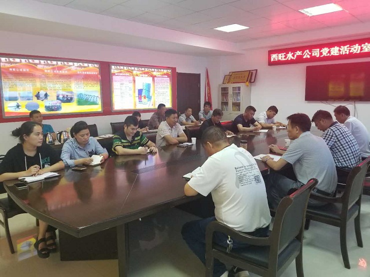 近日,西旺水产公司在该公司党建活动室召开了全体员工会议。会议传达了董事会关于公司高层人事变动的相关精神,以及公司的相关工作要求。会议由该公司董事长王德志同志主持,全体员工参加了会议。