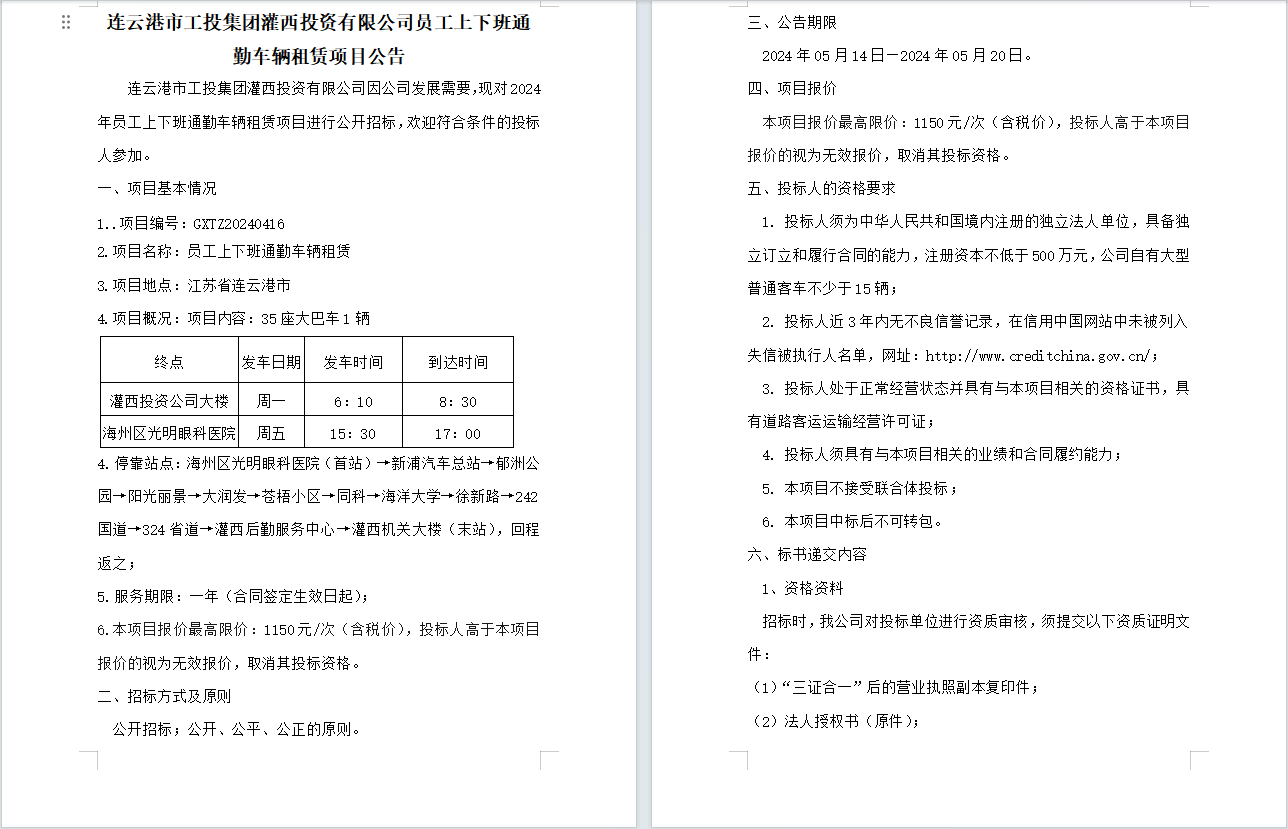 连云港市工投leyu(中国)灌西投资有限公司员工上下班通勤车辆租赁项目公告