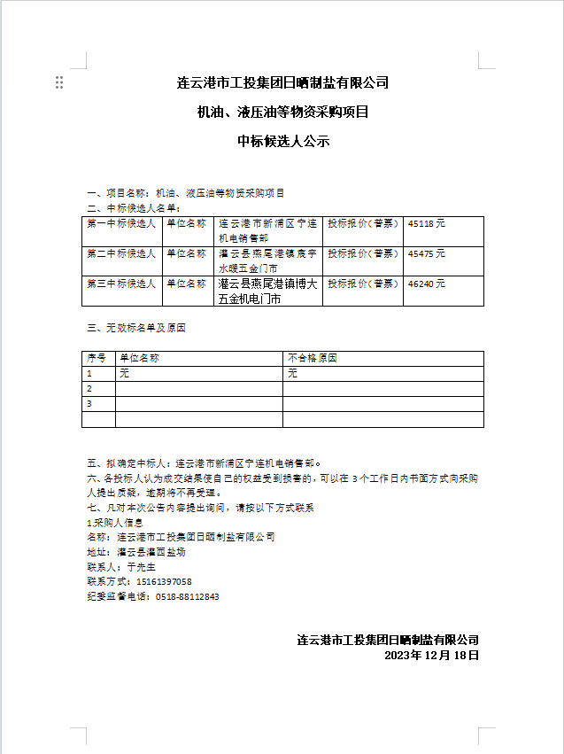 连云港市工投leyu(中国)日晒制盐有限公司 机油、液压油等物资采购项目中标候选人公示
