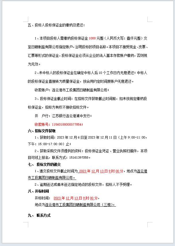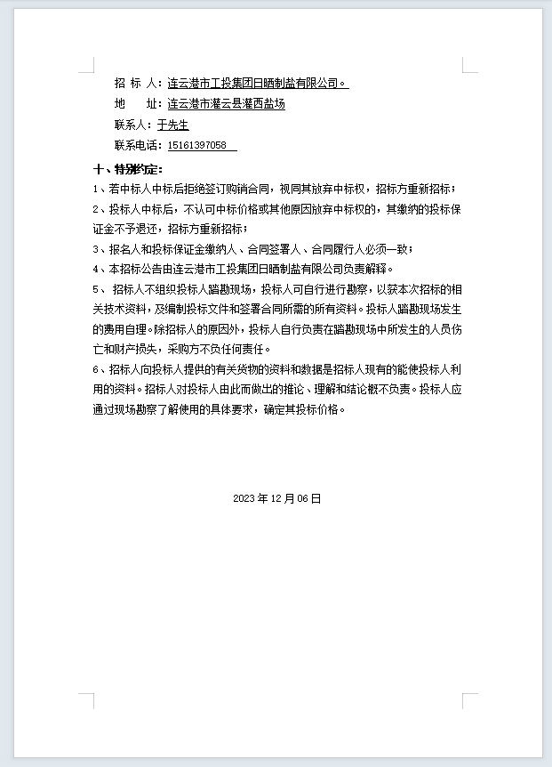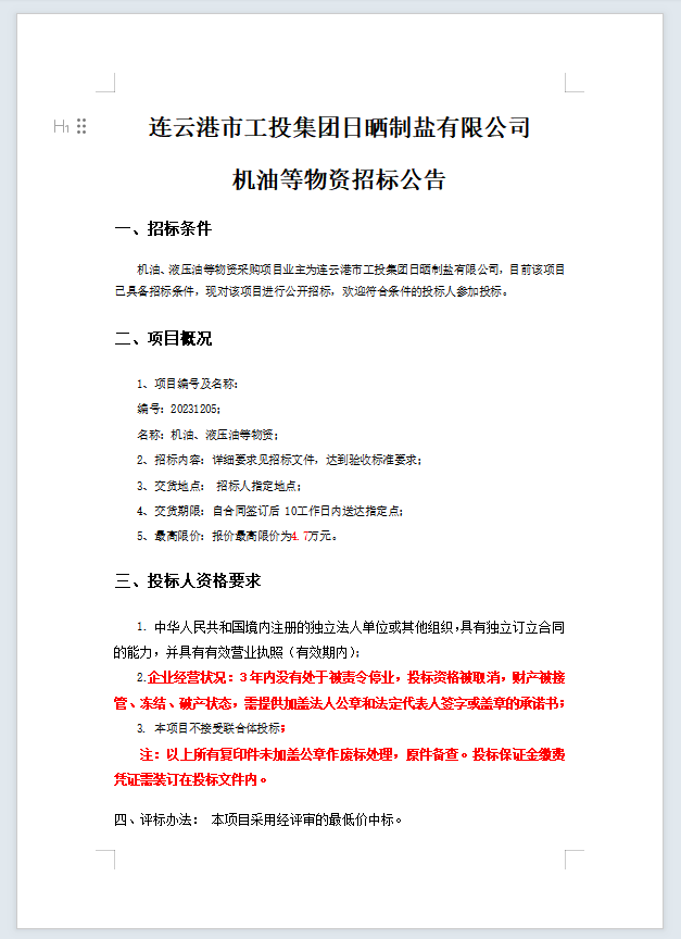 连云港市工投leyu(中国)日晒制盐有限公司机油等物资招标公告