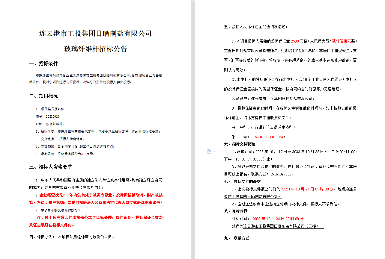 连云港市工投leyu(中国)日晒制盐有限公司玻璃纤维杆招标公告
