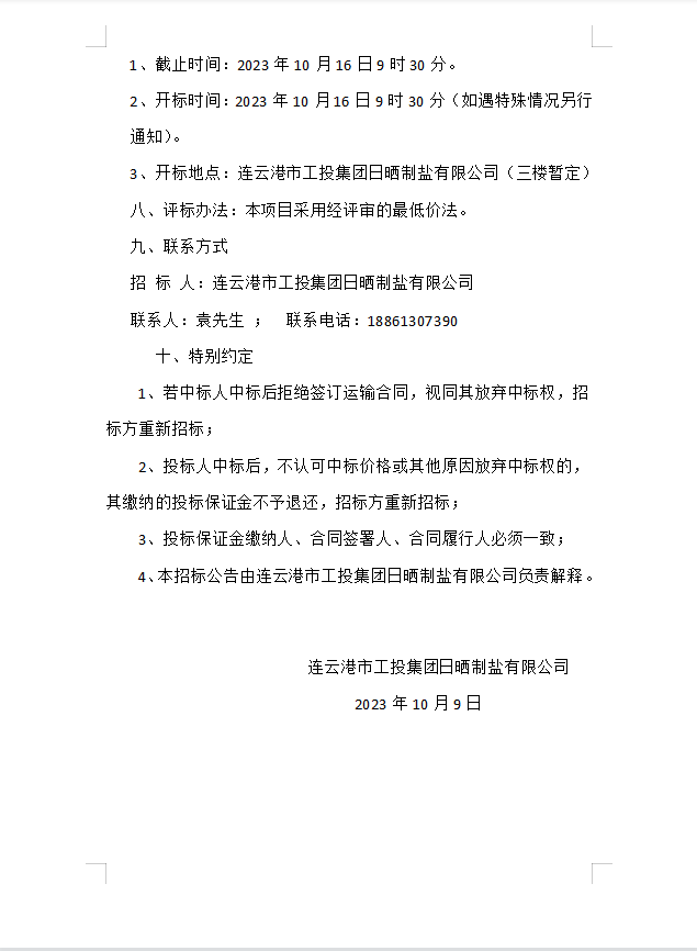 连云港市工投leyu(中国)日晒制盐有限公司 海运物流服务业务招标二次公告