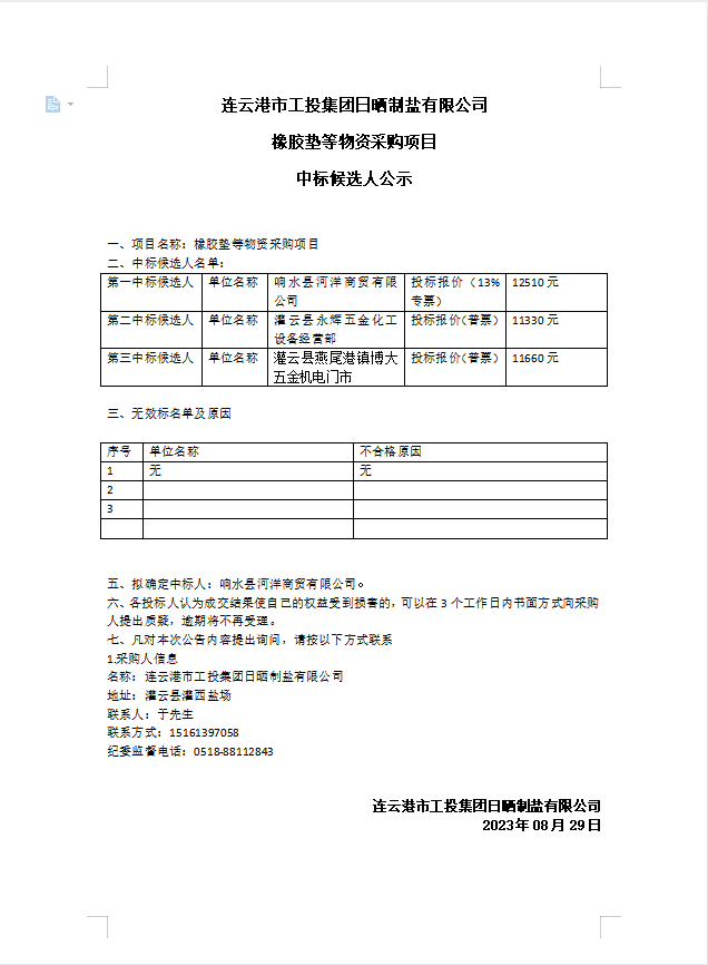 连云港市工投leyu(中国)日晒制盐有限公司橡胶垫等物资采购项目中标候选人公示