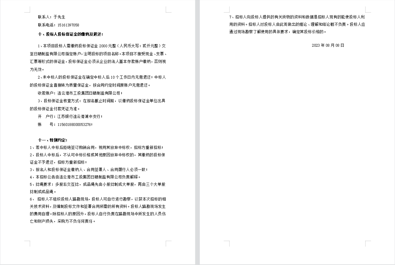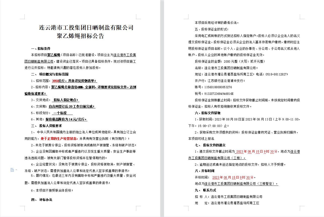 连云港市工投leyu(中国)日晒制盐有限公司聚乙烯绳招标公告