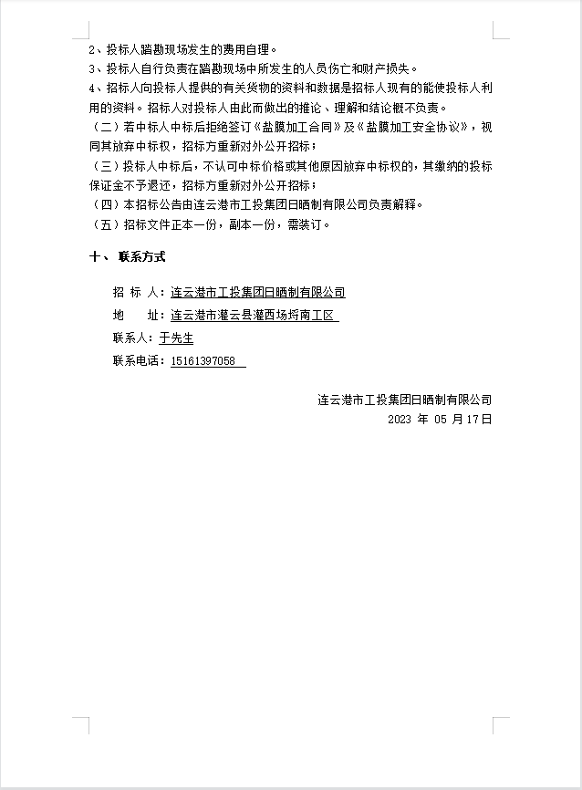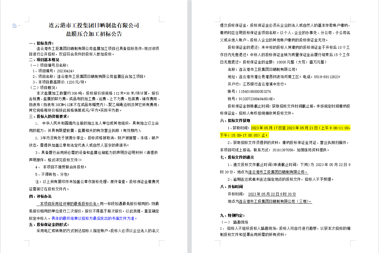 连云港市工投leyu(中国)日晒制盐有限公司盐膜压合加工招标公告
