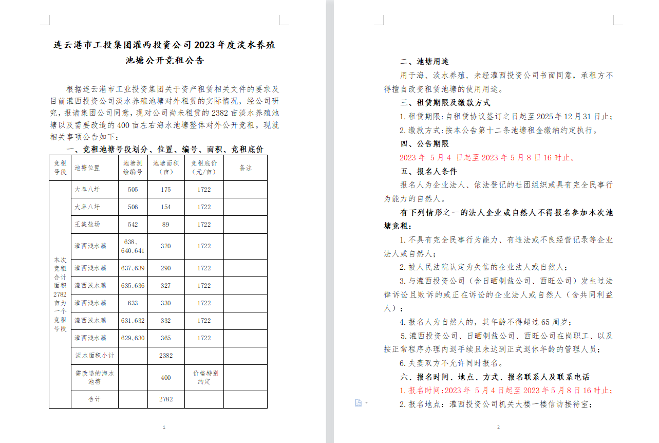 连云港市工投leyu(中国)灌西投资公司2023年度淡水养殖池塘公开竞租公告