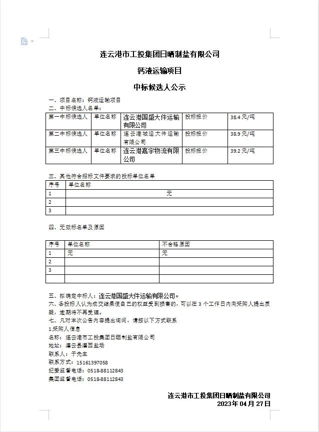 连云港市工投leyu(中国)日晒制盐有限公司钙液运输项目中标候选人公示