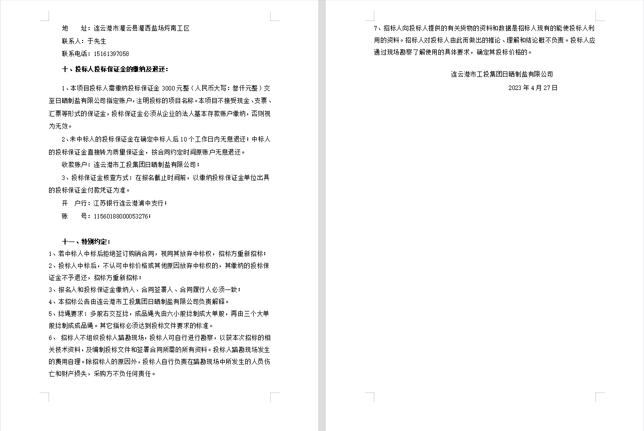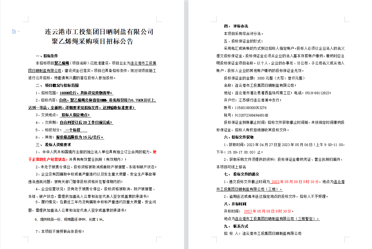 连云港市工投leyu(中国)日晒制盐有限公司聚乙烯绳采购项目招标公告