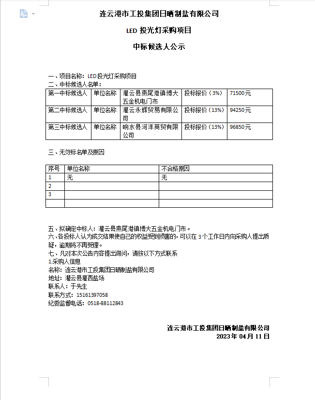 连云港市工投leyu(中国)日晒制盐有限公司LED投光灯采购项目中标候选人公示