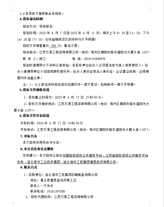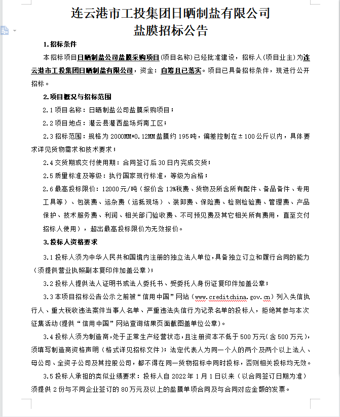 连云港市工投leyu(中国)日晒制盐有限公司盐膜招标公告