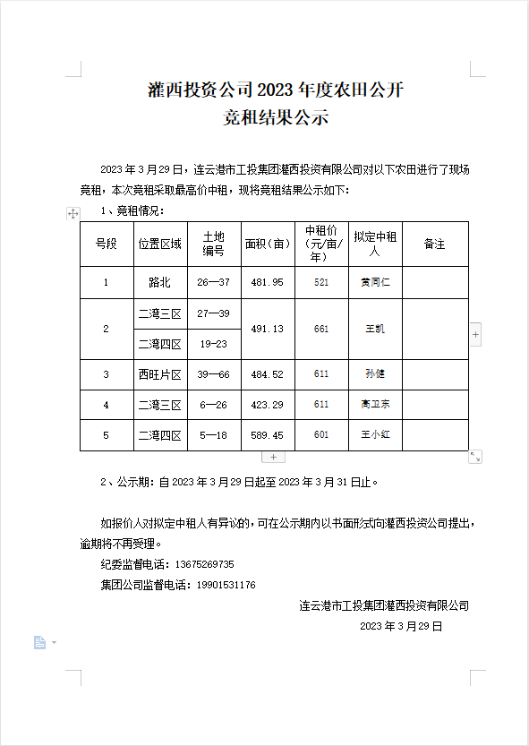 灌西投资公司2023年度农田公开 竞租结果公示