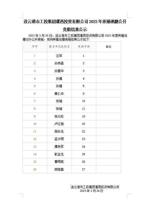 连云港市工投leyu(中国)灌西投资有限公司2023年养殖池塘公开竞租结果公示