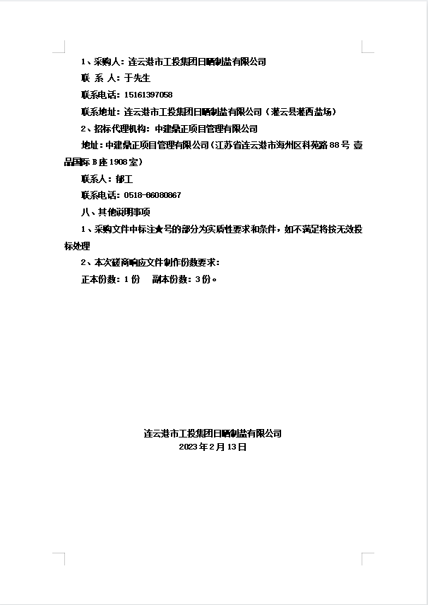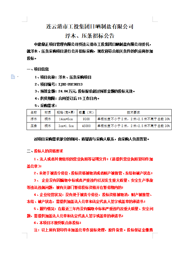 连云港市工投leyu(中国)日晒制盐有限公司浮木、压条招标公告