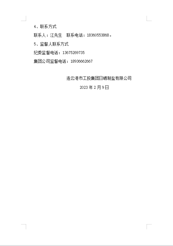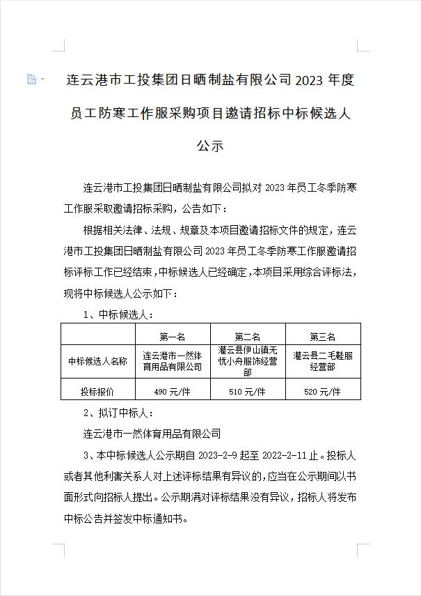 连云港市工投leyu(中国)日晒制盐有限公司2023年度员工防寒工作服采购项目邀请招标中标候选人公示