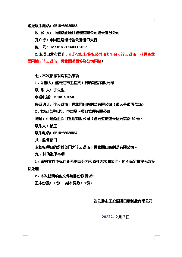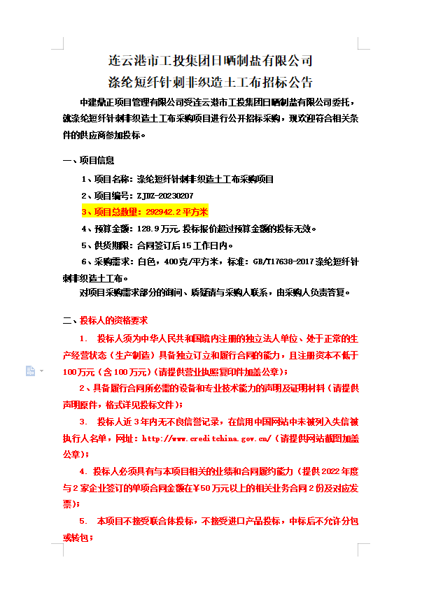连云港市工投leyu(中国)日晒制盐有限公司涤纶短纤针刺非织造土工布招标公告